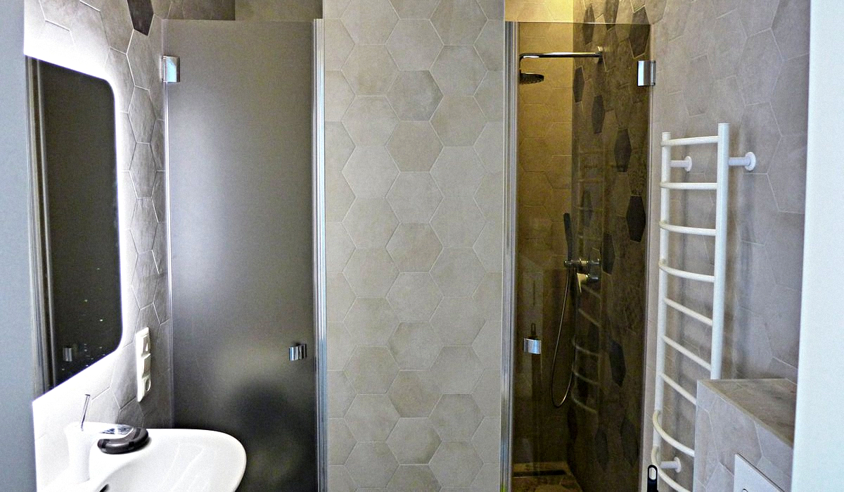 Bathroom: A shower, a sink with a mirror, a washing machine, and a toilet.