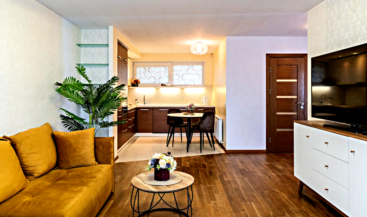Shared kitchen combined with a living room: A sunny room with all necessary appliances, kitchen utensils, a dining table, a fold-out sofa, and a Smart TV.