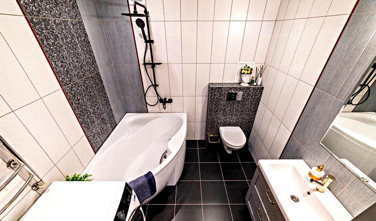 Shared Bathroom: A bathtub, a sink with a mirror, a washing machine, and a toilet.