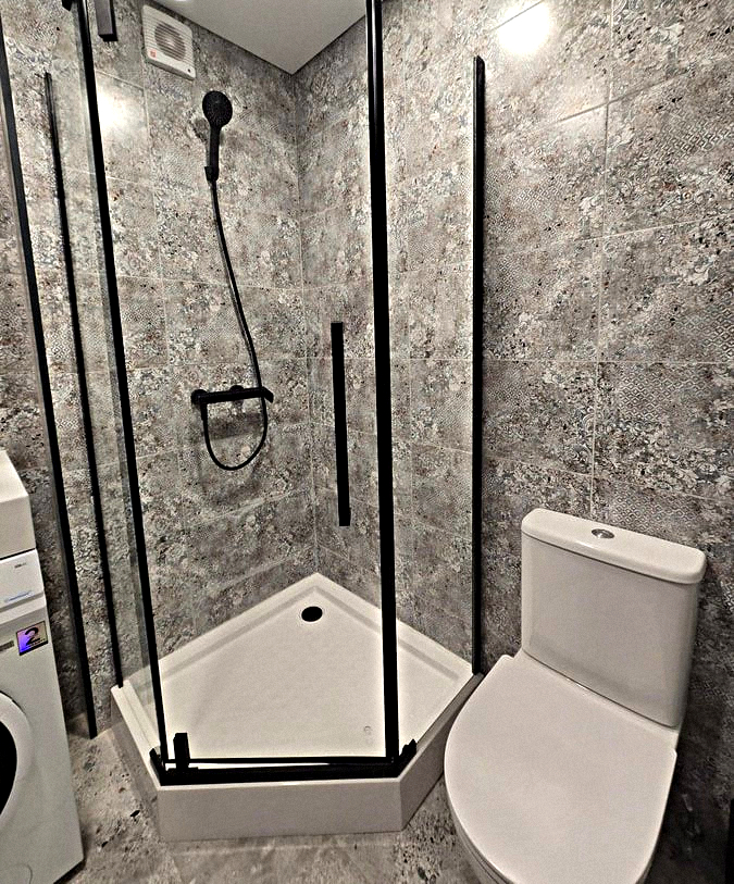 Bathroom: Shower stall, sink with mirror, washing machine, and toilet.