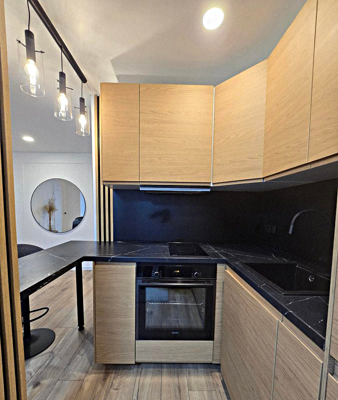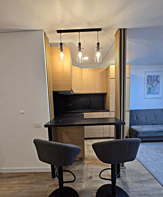Kitchen-living room: Spacious room with all necessary appliances, kitchen utensils, a dining table, and a small sofa.