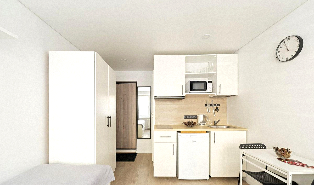 Kitchen-Bedroom: This sunny and bright room features all necessary appliances, kitchen utensils, a dining table, a wardrobe, a fold-out double bed, and a Smart TV.