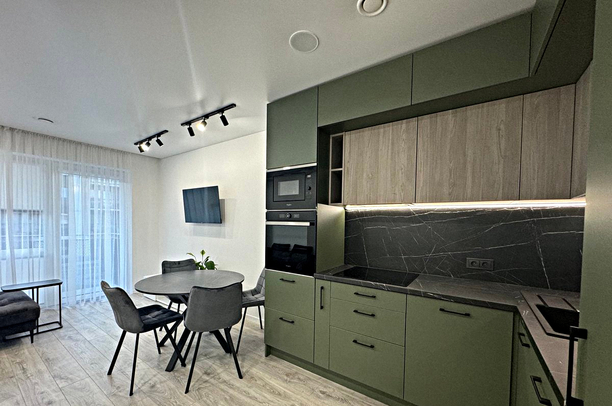 Kitchen/Living Room: Sunny room with all necessary appliances, kitchen utensils, dining table, small sofa, and Smart TV.