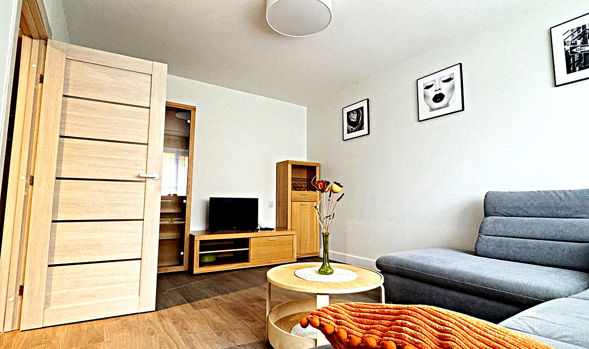 Bedroom: A cozy room with a double sofa bed, a wardrobe, and a Smart TV.