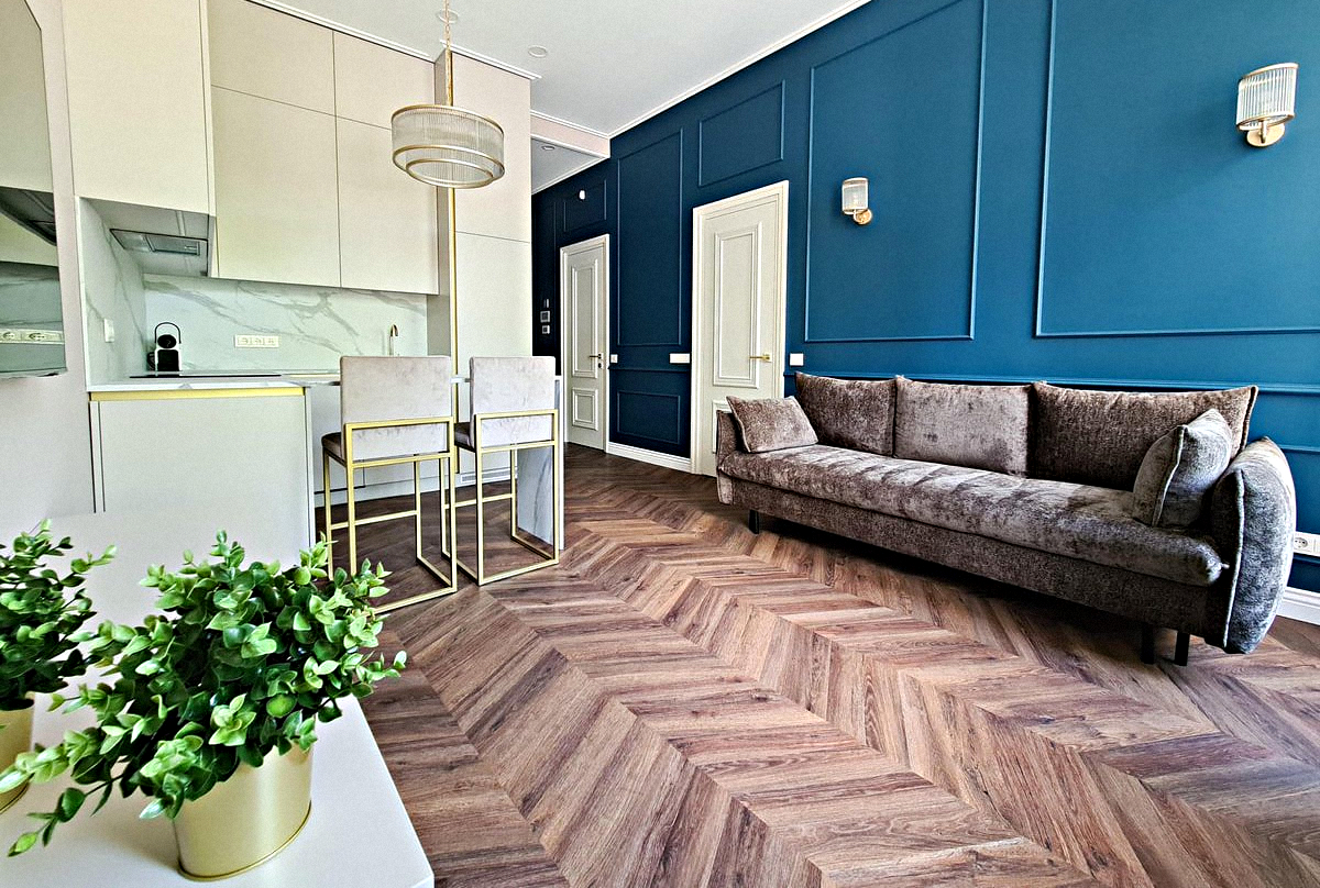 Shared kitchen combined with a living room: A sunny room with all necessary appliances, kitchen utensils, a small sofa, a dining table, a small sofa bed, and a Smart TV.