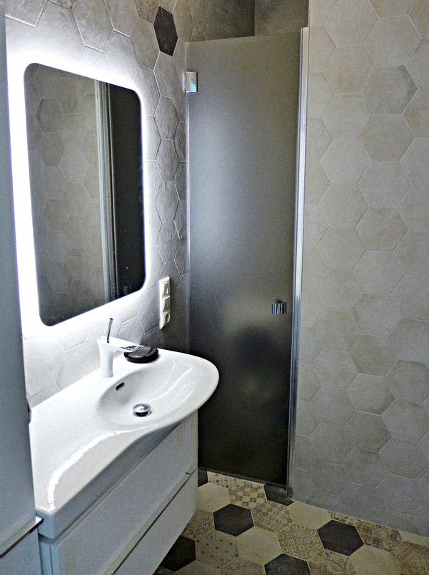 Bathroom: A shower, a sink with a mirror, a washing machine, and a toilet.