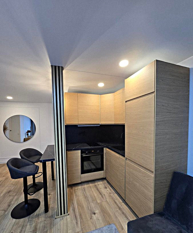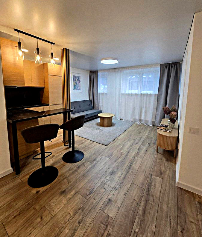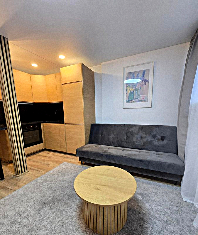 Kitchen-living room: Spacious room with all necessary appliances, kitchen utensils, a dining table, and a small sofa.
