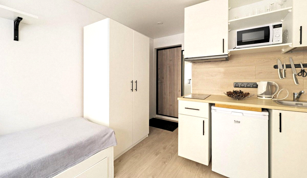 Kitchen-Bedroom: This sunny and bright room features all necessary appliances, kitchen utensils, a dining table, a wardrobe, a fold-out double bed, and a Smart TV.