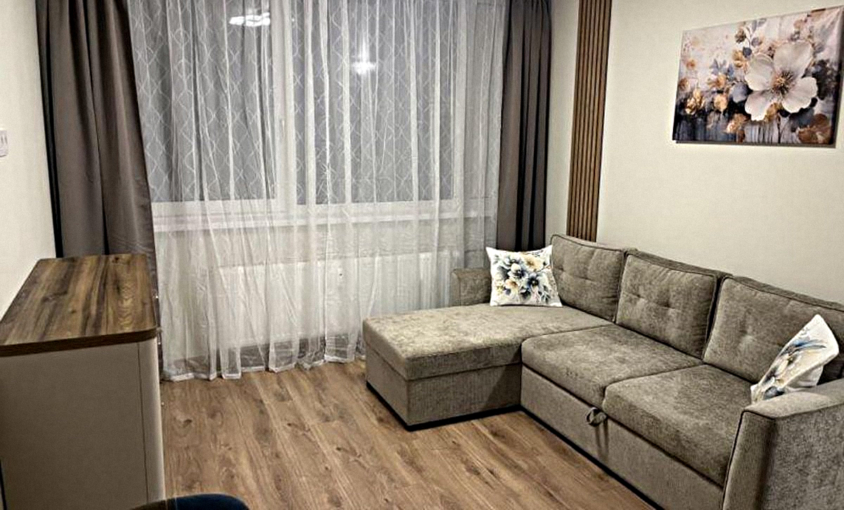 Kitchen/Living Room: Spacious room with all necessary appliances, kitchen utensils, a dining table, and a fold-out double bed.
