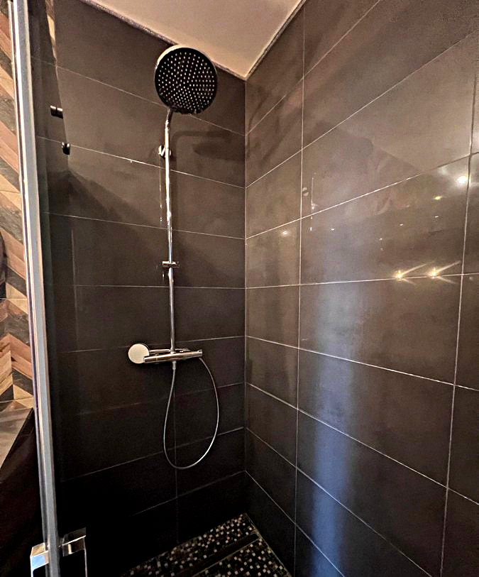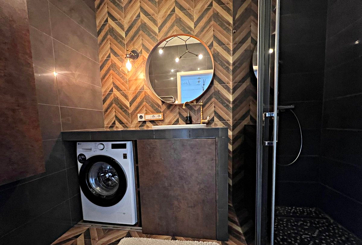 Shared bathroom: Equipped with a shower cabin, a sink with a mirror, and a washing machine.